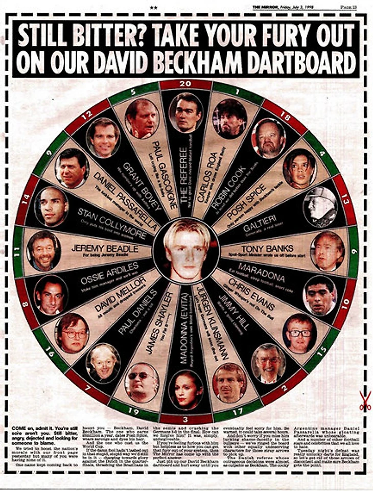 Следующий удар нанесли газеты. The Mirror выдал заголовок «10 львов и один глупый мальчик», а The Sun выпустил изображение мишени для дартса с фотографией юного Бекхэма. «Еще злитесь? Выместите ярость на нашей мишени с Дэвидом Бекхэмом».