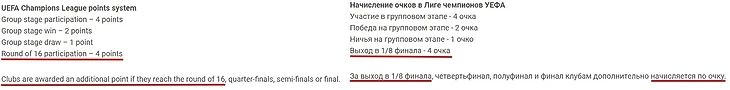 1.В правилах дважды сказано, про баллы, которые начисляются на выход в плей-офф Лиги чемпионов. Сначала сказано за выход в 1/8 начисляется 4 балла, а ниже сказано, что дополнительный балл начисляется за выход в 1/8, 1/4 и т.д.
