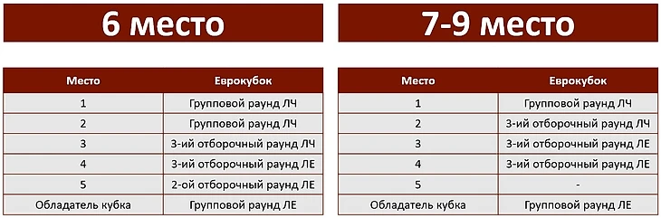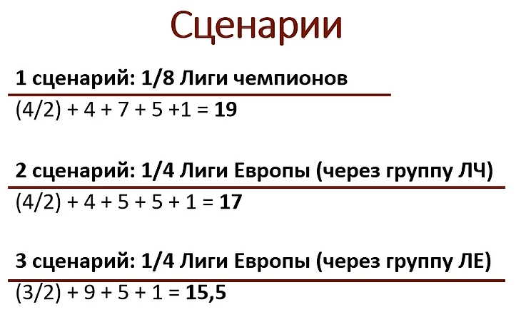 Вообще все расчеты сводятся к одному: если РПЛ занимает 6-е место и делегирует 6 клубов, чтобы российским клубам набрать для лиги 10 рейтинговых очков (приблизительно средний показатель для РПЛ за 5 лет), российским клубам необходимо в совокупности набрать 60 очков. Ну или каждому клубу по 10 баллов (это меньше 5 побед за время нахождения клуба в еврокубках, т.к. существуют надбавки на проход в следующий раунд). Если клуб находится на 7-9 местах и делегирует в еврокубки 5 клубов то, чтобы набрать 10 рейтинговых очков для лиги, клубам в совокупности нужно набрать 50 очков. Это те же самые 10 очков на клуб, менее 5 побед на каждый. Правда это касается только групповых этапов и более высоких стадий