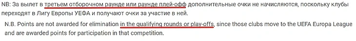 2. Претензия к русскоязычной версии сайта (этот пункт касается не рейтинга лиг, а рейтинга клубов, но все равно нормальному восприятию информации мешает). На сайте сказано, что клубам, которые вылетели из 3‑его квалификационного раунда или раунда плей-офф, баллы не начисляются, т.к. данные клубы отправляются в розыгрыш ЛЕ. Но никаких разъяснений по поводу того, что же с клубами, которые вылетают раньше, нет. Если же открыть английскую версию сайта, то можно прочитать, что все клубы, вылетевшие из отбора в групповой этап ЛЧ, отправляются в ЛЕ.
