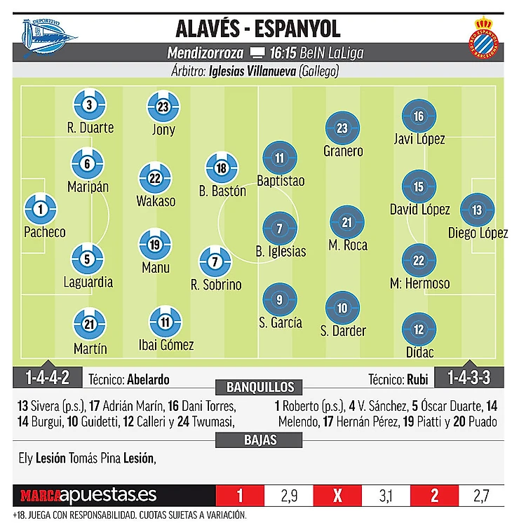 Вторая подряд игра для Алавеса в Мендизароззе. После ничьи с Бетисом в первом домашнем матче Абелардо хочет выиграть у Эспаньола. В первые в заявку попал новичок команды Джонатан Кальерри. По прежнему не доступны Родриго Эли и Томас Пина. Эспаньол Руби стремится продемонстрировать свой высокий потенциал и набрать очки в Мендизароззе, что позволить каталонцам удержаться на верху турнирной таблицы. Абелардо на пред матчевой пресс конференции выразил удовлетворение развитием своей команды, где, особенно, выделили второй тайм в матче с Бетисом. И с большой долей вероятности мы увидим тот же стартовый состав, что был в игре с командой Сеттьена. Алавес нуждается в усилении атаки, особенно, после без голевых стартовых 2х туров и приход в команду Кальерри должен обеспечить команду забитыми мячами, как утверждает сам Абелардо. Также в прошлую пятницу команда пополнил Дарко Брашанац, который стал седьмым новичком в команде. Были подписаны контракты с Гвидетти и Пина, который выступали за Алавес на правах аренды. Эспаньол так же подписал нового игрока в пятницу. Команду Руби пополнил Роберто Росалес, но на матч с Алавесом не заявлен. Главный тренер без сомнений будет опираться на тот же состав, что и был в матче с Валенсией и каких либо изменений мы тут вряд ли увидим. Не вооруженным взглядом видно, что Эспаньол с приходом Руби обретает новую силу и переживает эмоциональный подъем. После побед в 6ти товарищеских играх Эспаньол не знает горечи поражения и в стартовых двух турах чемпионата. Команда прекрасно усвоила схему 4-3-3 и концепции нового тренера.