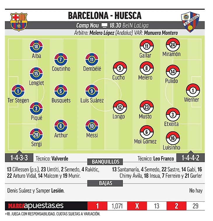 Чемпион против дебютанта. Но, очевидно, что два результата, добытые Уэской требуют серьезного анализа со стороны Барселоны, ведь новичок обычно не начинает чемпионат с победой в Ипуре и ничьей на Сан Мамесе. И по этой причине вряд ли мы увидим какие либо изменения в стартовой составе команды Вальверде. Много внимания уделяется Луису Суаресу, который находится не в лучших своих игровых кондициях. И не припомню такого, чтобы Суарес не забивал в трех матчах к ряду. Несмотря на то, что Барселона располагает глубиной состава Суарес без сомнений сегодня будет включен в первые 11, ведь чем быстрее наберет форму Луис тем будет лучше для самой же команды. Барселона удачно выступает против не самых сильных соперников и у нее сейчас нет такой болезни как было иногда при Луис Энрике, когда каталонцы могли свести в ничью матчи подобного рода. Думаю, что Барселона попытается избежать какого либо расслабления и будет настроена эту игру.