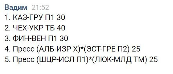 Буду проигрывать- буду составлять прессы из точных счетов. И только не говорите, что таких линий в турнире нет. ))))