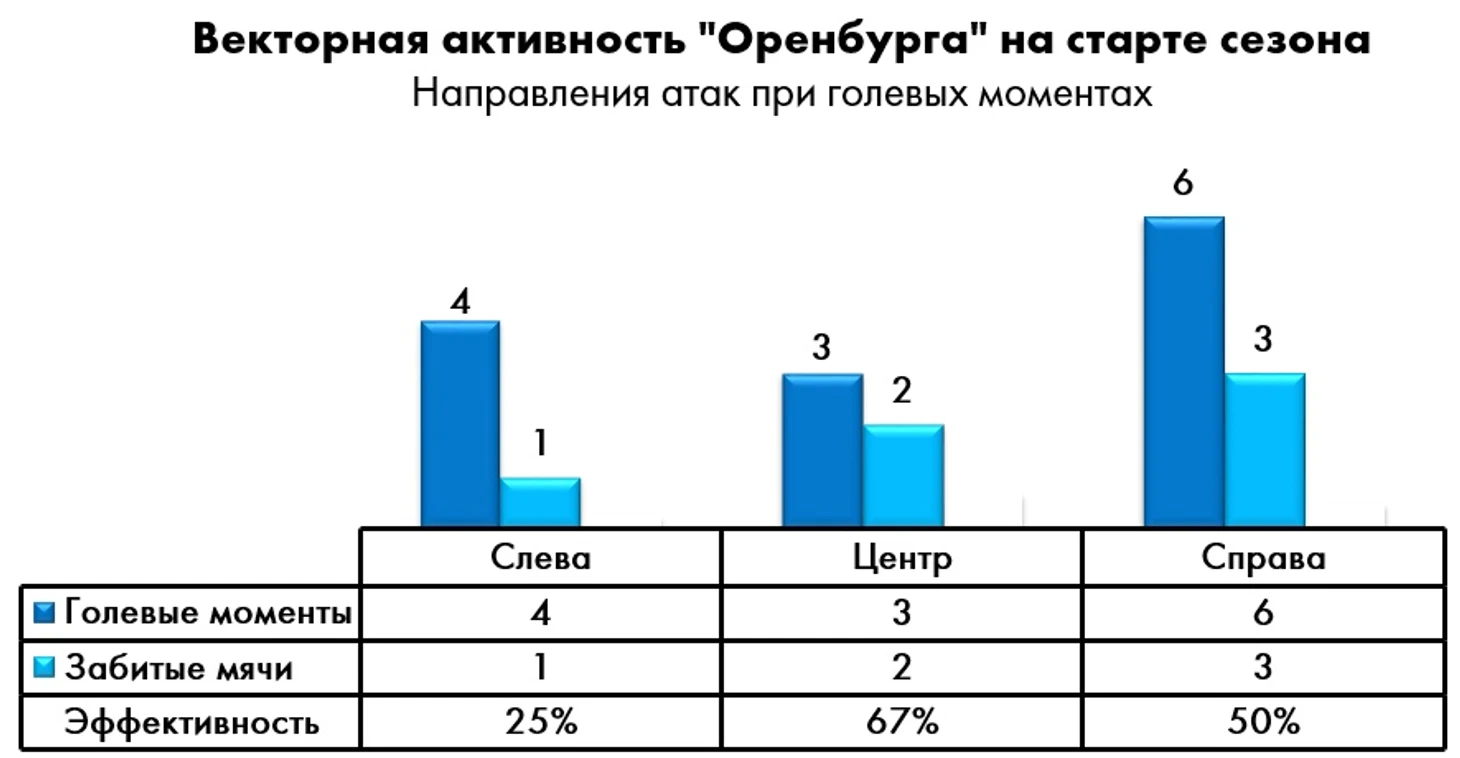 «Оренбург» максимум остроты создаёт как раз на периферийных направлениях, активно задействуя крайних защитников и создавая численное большинство на полуфлангах.