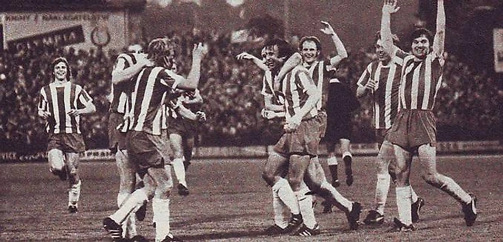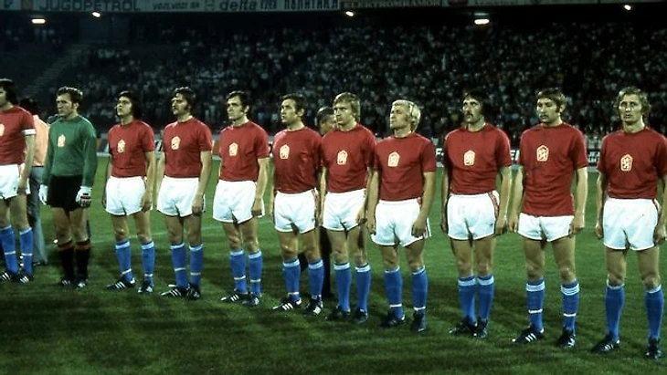 Финальный турнир проходил в Югославии, в Загребе и Белграде, и в нем участвовало лишь четыре (!) команды. Справившись лишь в дополнительное время с голландцами (3:1), они вышли в финал на фаворитов - Сборную ФРГ. Немцы отыгрались с 2:0 и довели игру до серии пенальти. Все были точны, кроме сегодняшнего президента "Баварии" - Ули Хенесса, а победную точку поставил именно легендарный удар Антонина Паненки. Ниже мы видим команду будущих победителей (Антонин - третий справа).