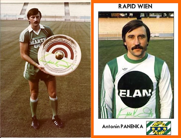 Всего же Паненка отыграл за "Богемианс" 230 игр и отличился 76 раз, что очень неплохо. В начале 80-х, воспользовавшись потеплением отношений с западом, он уехал в Вену, где еще четыре года выступал за местный "Рапид" (ниже на фотографиях: как мы видим, он оставался верным столь редким бело - зеленым цветам команды). Кстати, в отличие от многих полузащитников, которые под конец карьеры смещаются все ближе к защите и оттуда руководят игрой, Антонин открыл в себе небывалые бомбардирские способности. Всего лишь за четыре года карьеры в Австрии он забил 63 мяча в 127 играх (став в сезоне 1983/84 лучшим нападающим лиги), практически столько же, сколько за 14 лет в футболке чешской команды. На мой взгляд, именно эта перемена как ничто другое показывает, насколько сильным был Чемпионат Чехословакии в семидесятых годах минувшего столетия.