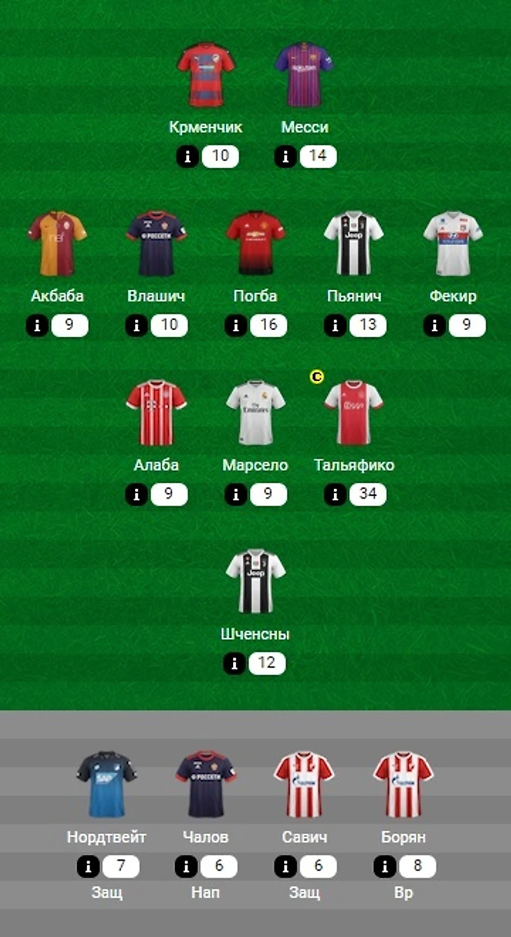 Здесь также могли быть Леонардо Бонуччи 6,0 - Ювентус (заработанный пенальти + СМ) - 9 очков и Жоау Канселу 6,0 - Ювентус (заработанный пенальти + СМ) - 9 очков, если бы не лимит в два игрока из одной команды, а на замене Исмаили дос Сантос 6,0 - Шахтер (Г - 2Пр) - 7 очков и Хосе Хименес 6,0 - Атлетико (Г - ЖК) - 7 очков, если бы не ограничение по стоимости команды.