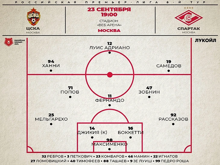 «Спартак»: Максименко, Рассказов, Боккетти, Джикия (к), Мельгарехо, Фернандо, Зобнин, Самедов, Попов, Ханни, Луис Адриано.