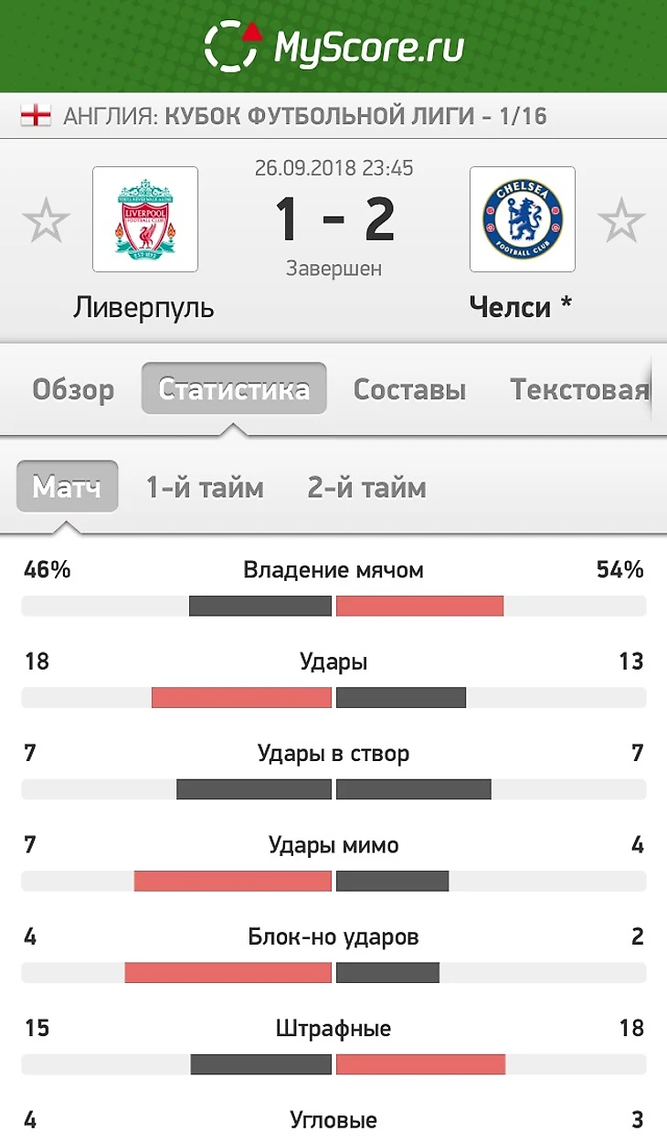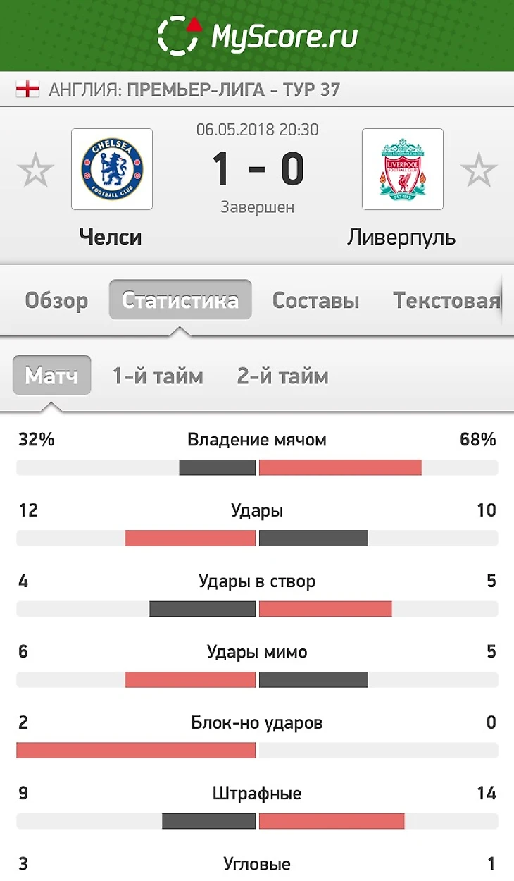 Встреча на Стэмфорд Бридж 6 мая 2018 года закончилась минимальной победой Челси. Команда Конте владела мячом 32% времени и позволила красным нанести 5 ударов в створ ворот (против 4 позволенных Ливерпулем), успешно проведя в обороне большую часть матча. Матч за Кубок английской лиги, состоявшийся в прошлую среду, стал гораздо более атакующим – команды обменялись 7 ударами в створ ворот соперников, а Челси владел мячом на Энфилде 54% времени.