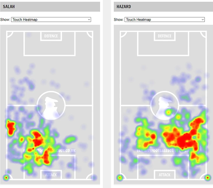 Атакующим полузащитникам, вероятно, будут противостоять Александр-Арнольд и Гомез со стороны Ливерпуля, а также Алонсо и Луиз со стороны Челси. Противостояние сразу с двумя защитниками кажется оправданным – во-первых, существенные атакующие показатели Азара и Салаха потребуют нейтрализации группой игроков, когда один защитник вступает в единоборство, а второй страхует (мы помним, как легко в финальной фазе Азар прошел одного Морено и не встретил подстраховки в матче на Кубок), а во-вторых, характер игры атакующих полузащитников предполагает регулярные смещения в центр, что может быть наглядно представлено тепловой картой.