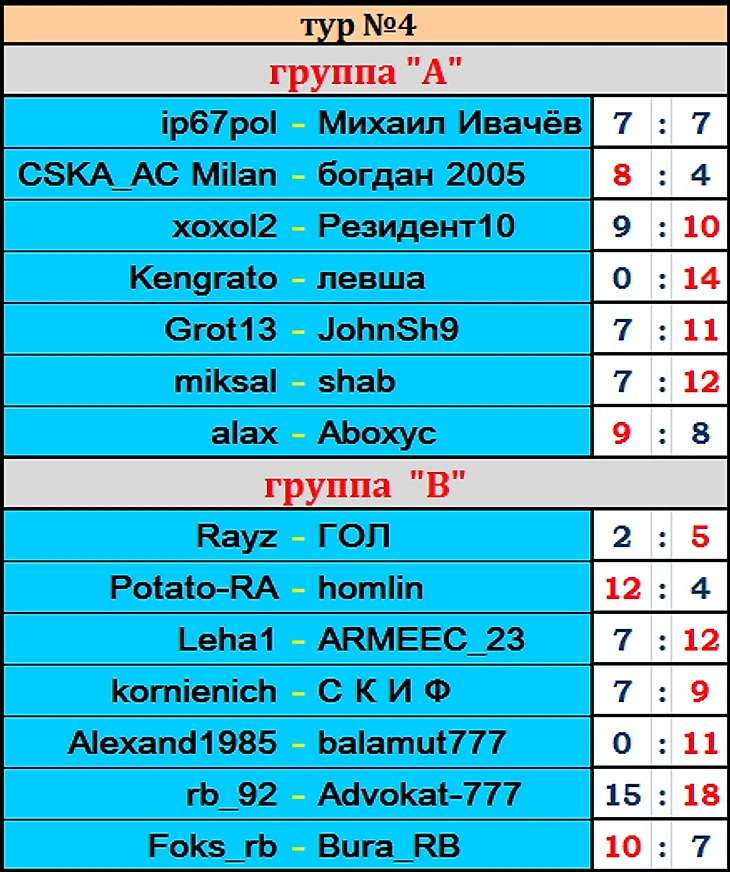 А вообще получился тур а-ля каттеначио. И даже есть 5:2 ! ! ! Во даёт лидер группы-2 ! ;0)