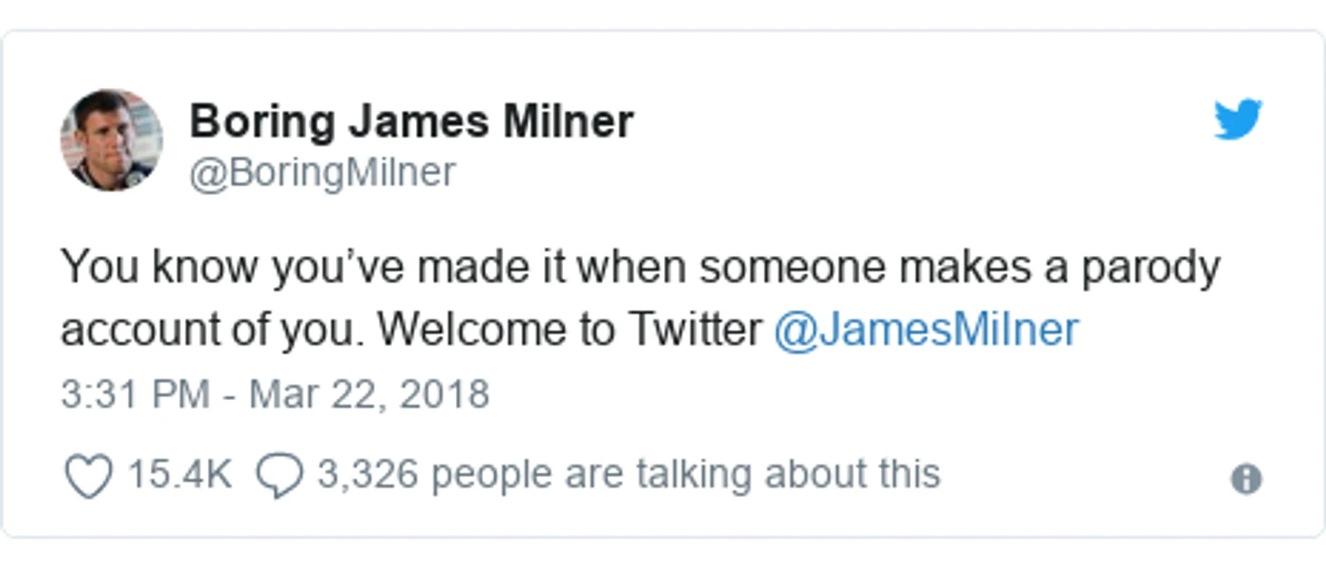 "Ты осознаешь что добился чего-то в жизни когда кто-то сделает пародийный аккаунт на тебя. Добро пожаловать в Твиттер, @JamesMilner"