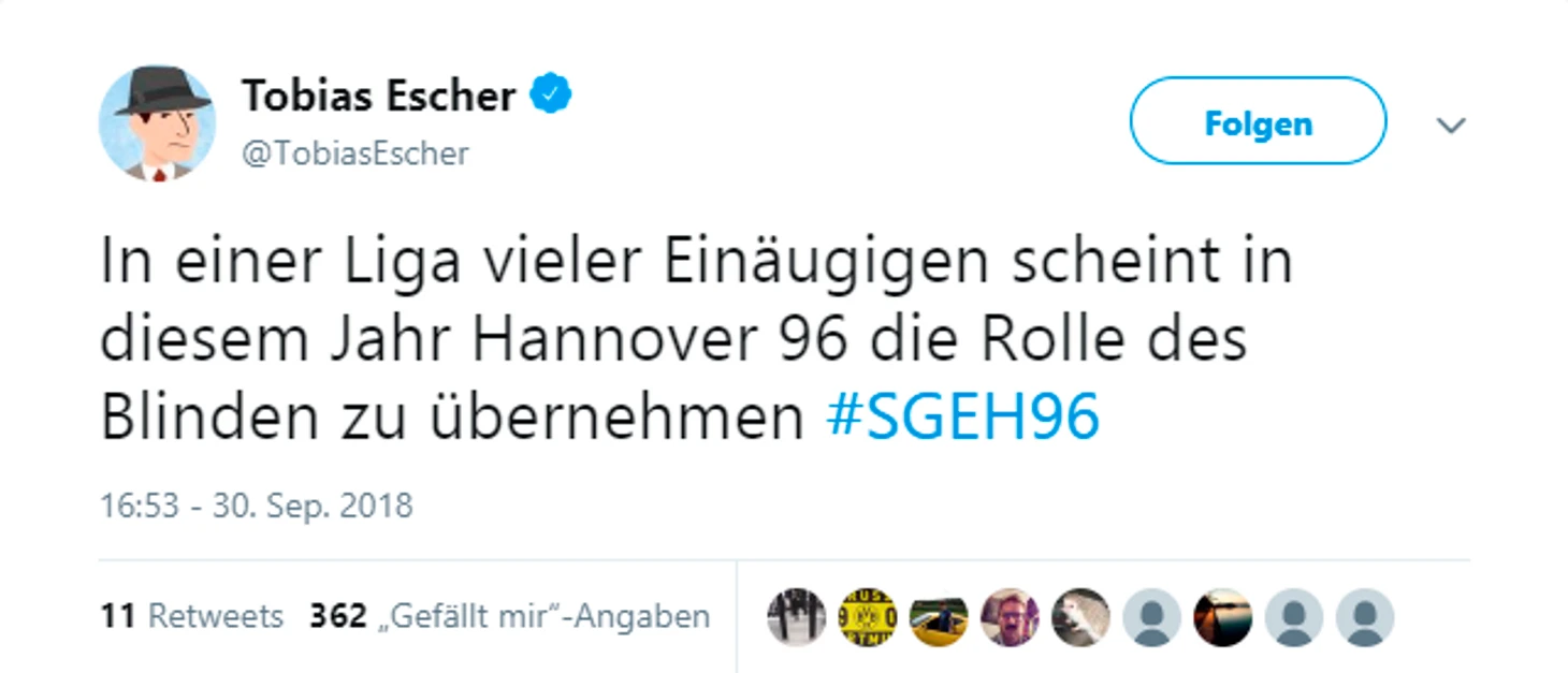 Франкфуртский «Айнтрахт» едва ли может занести себе в актив старт сезона — у обладателя Кубка Германии была лишь одна победа в пяти играх и та была добыта еще в первом туре. «Ганновер» и вовсе подошел к шестому туру без побед, и по его итогам сменил «Шальке» на последней строчке таблицы.