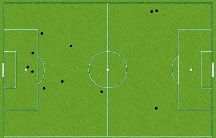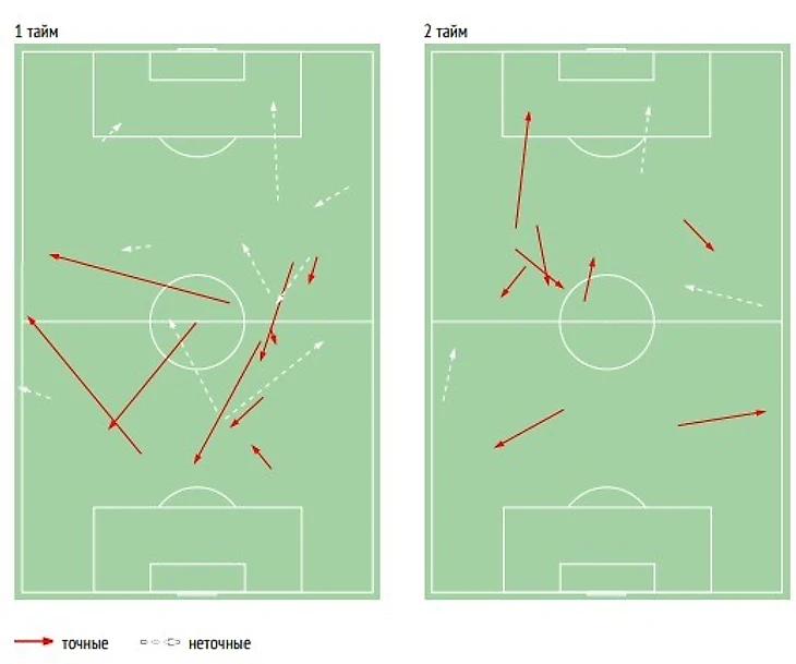 В результате он был очень много вовлечен в игру (29 передач/17 точных – высокий показатель для форварда), позволял команде сохранять владение и был нацелен на острое решение в финальной фазе атаки. Он выполнил 5 ключевых пасов – больше всех в команде, но, к сожалению, только однажды точно, что и сказалось на общем браке в передачах (59%).
