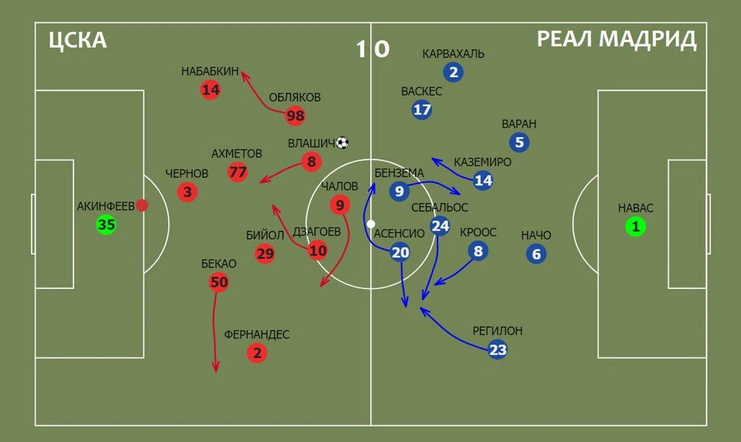 Но основной акцент был на розыгрыш мяча между зонами и стремление использовать пространство за спиной высоко оборонявшихся защитников «Реала». В таких комбинациях основную роль выполняли Влашич, Чалов и Дзагоев.