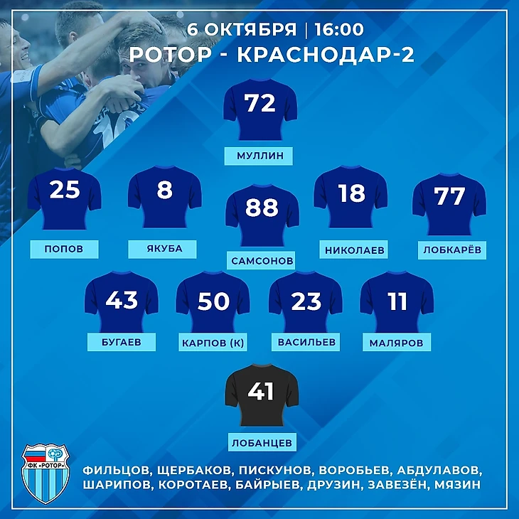 Состав «Краснодара-2»: Сафонов - Ивашин, Мартынов, Таранов (к), Бочко - Голубев, Мацукатов, Текучёв, Катрич - Онугха, Халназаров.