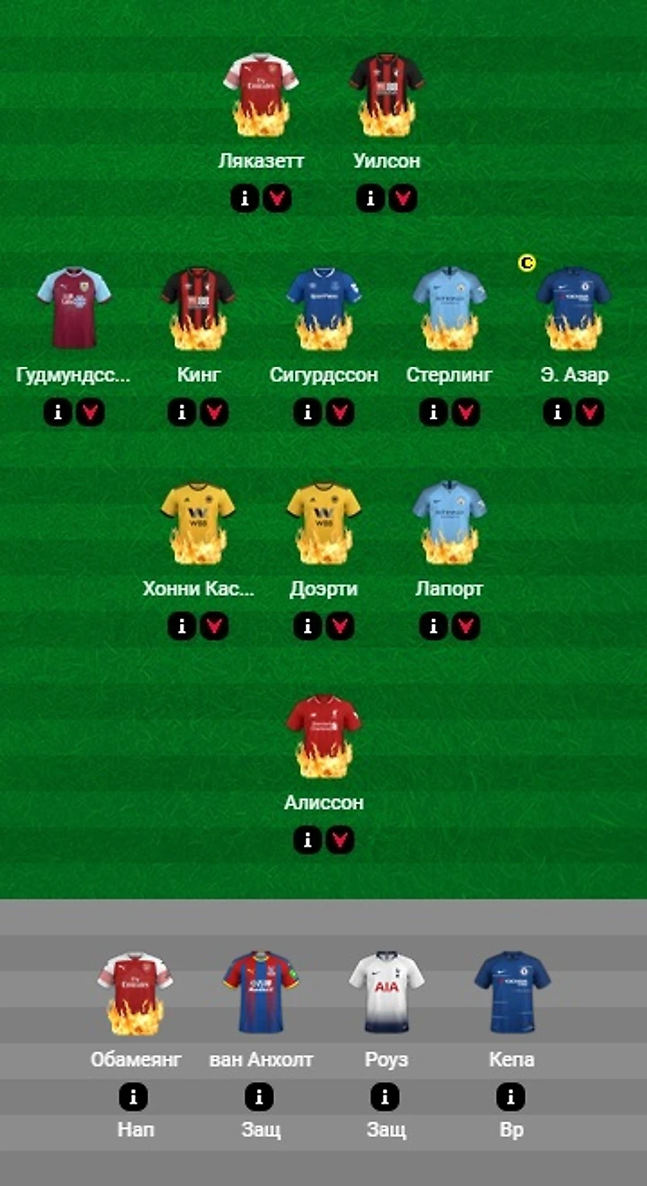 Интересный fantasy-факт. Если бы вы с первого тура набрали лучших игроков по очкам на данный момент и закэпили бы любого из них, то занимали бы сейчас первое место. Например, Азар(61), Алонсо(51), Уилсон(46), Стерлинг(44), Алиссон(43), Лапорт(42), Доэрти(42), Робертсон(42), Фрейзер(41), Ляказетт(41), Мэддисон(39*2), итого: 531. У лучшего игрока сейчас 519 очков.