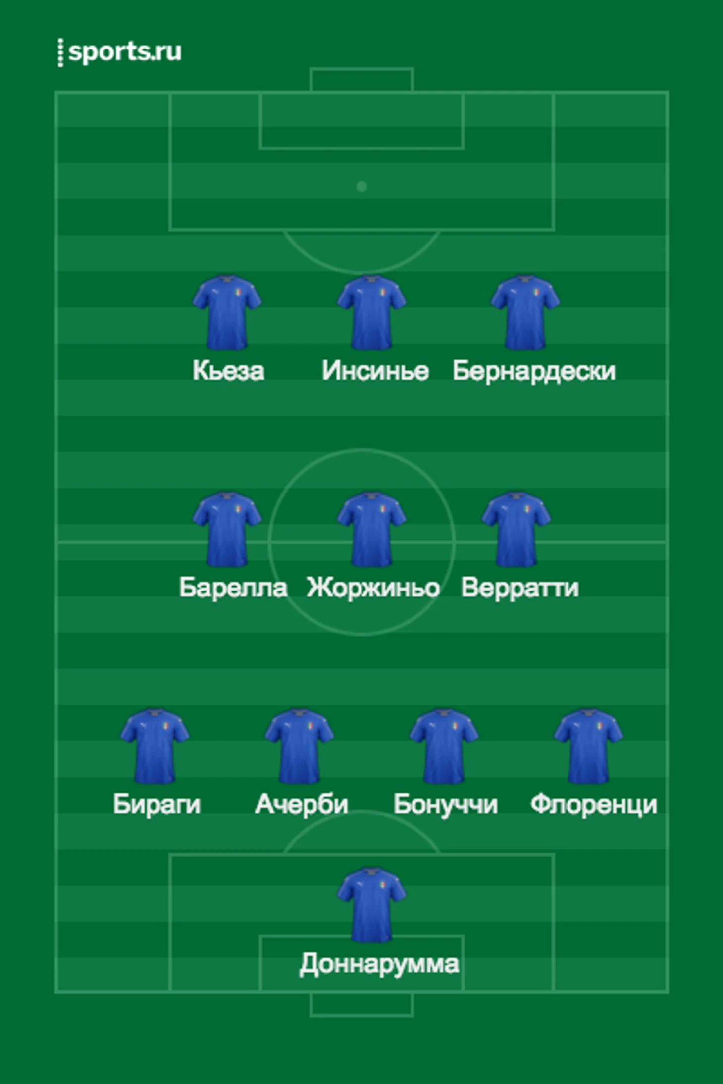 В средней линии мы наконец-то увидим вместе Жоржиньо и Верратти. Считается, что они могут эффективно взаимодействовать. Поставить рядом с ними Бареллу – не такая уж плохая идея. Почему не будет Кьеллини? Судя по всему, Манчо бережет его для Лиги Наций, хотя Италия почти вылетела из этого турнира.