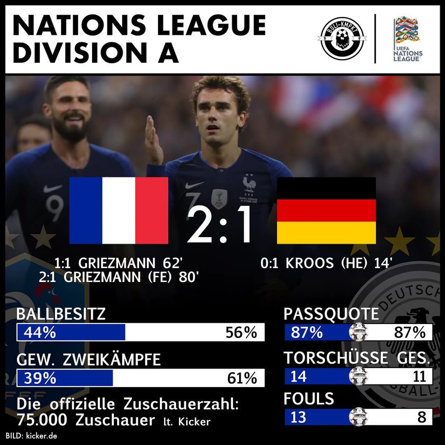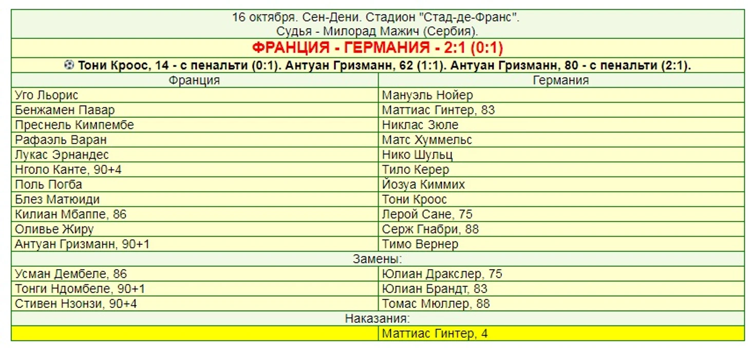 Как бы то ни было, Гризманн в отличие от Крооса пробил уверенно, и тоже забил. 2:1 – и в последние минуты игры только французы смогли еще раз создать опасный момент (пробивал Дембеле), а немцы скорее обозначали попытки отыграться. Хотя на поле и появились Брандт и Мюллер, но ничего, кроме преимущества в итоговом владении мячом они Германии в актив не дали. К тому же Дешам грамотно ломал игру немцев заменами – Дембеле, Ндомбеле и Нзонзи вышли на поле на 86-й, 91-й и 94-й минутах.