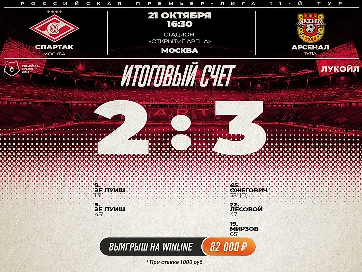 "Спартак" проиграл на своем поле тульскому "Арсеналу" - 2:3.