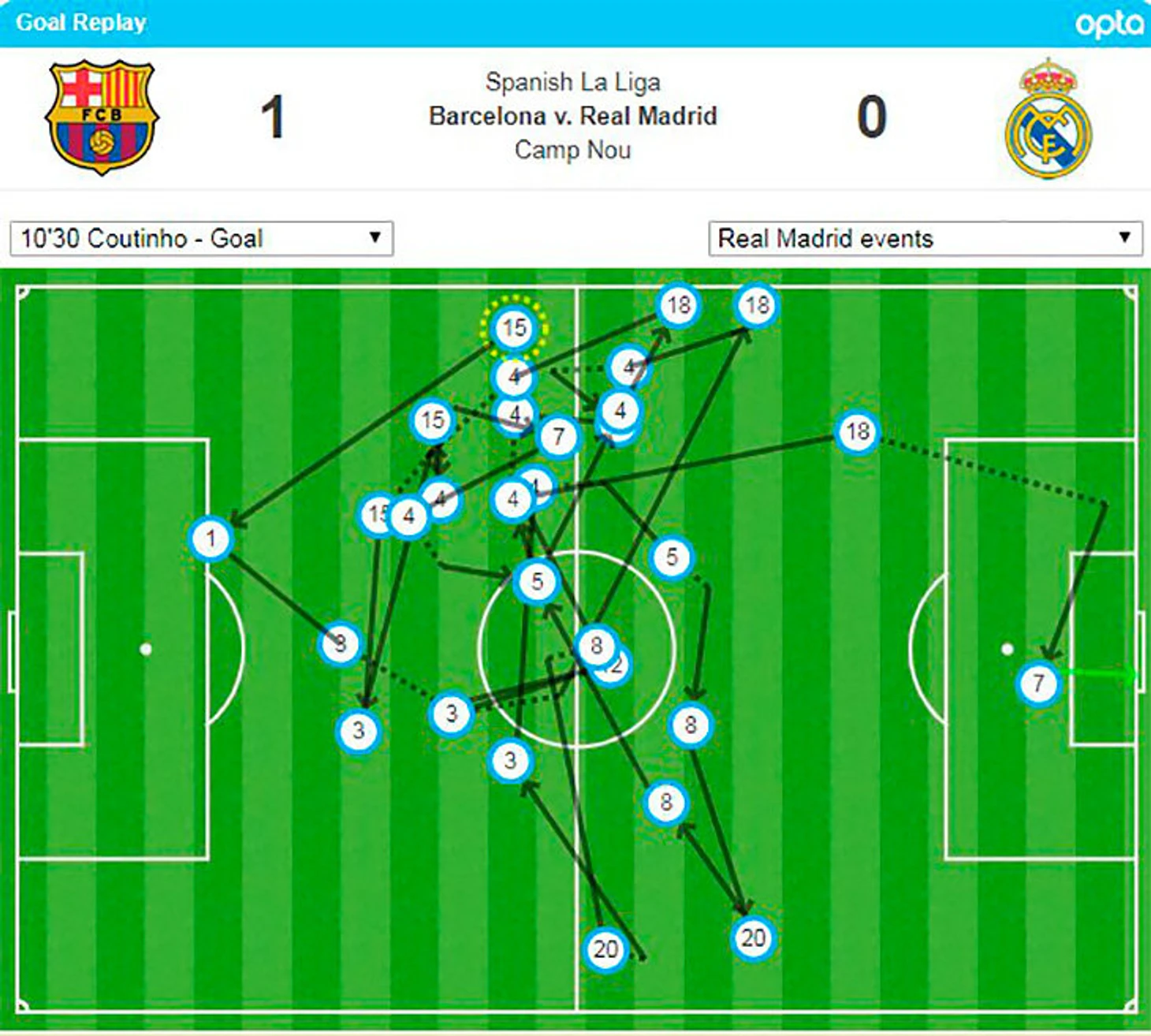 • У Коутиньо тем временем первый гол в класико – и какой: «Барса» забила его после 30 точных передач подряд. По статистике Opta, такого сложного гола в матчах «Реала» и «Барсы» не было 13 лет, с сезона-2005/06.