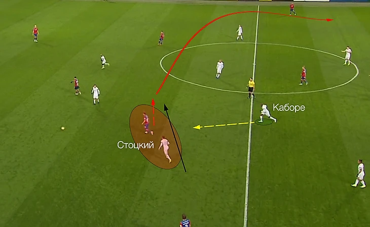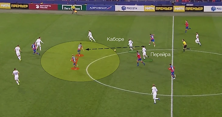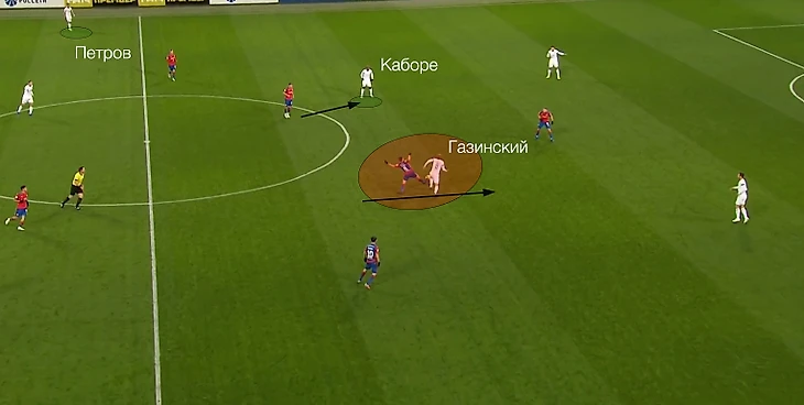 Обляков контролирует Каборе. Петров располагается слишком высоко и полностью отрезан от билдапа, Влашич накрывает Газинского и создает момент для ЦСКА.