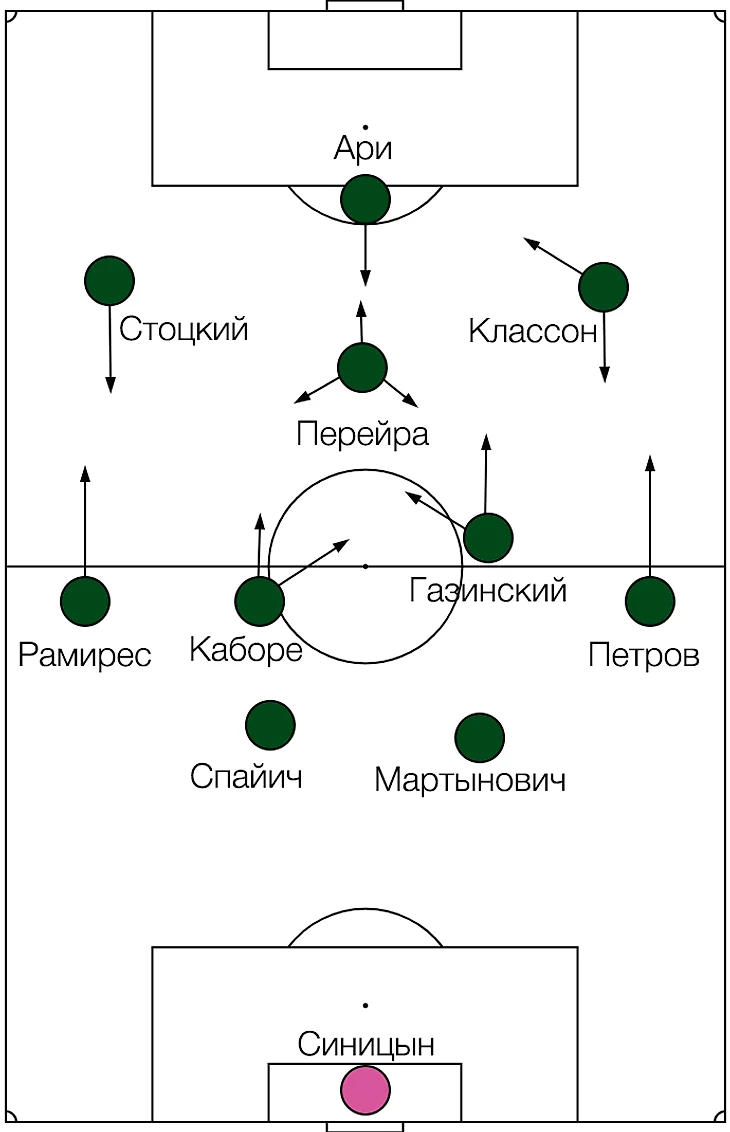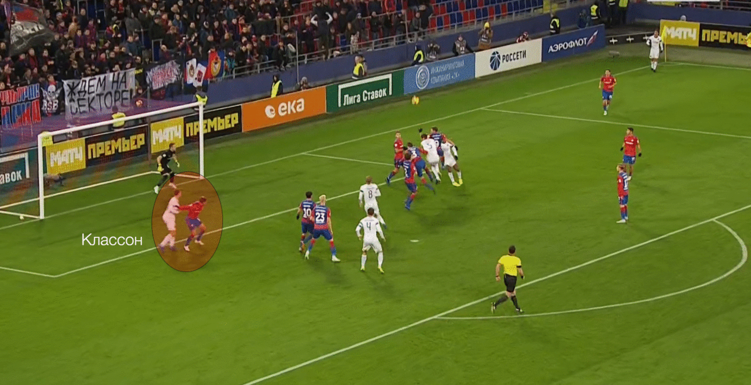 Черно-зеленые использовали свою излюбленную схему подачи углового, когда Классон (а ранее Газинский) открывается на дальней штанге под сброс из центра. Игроки ЦСКА были готовы к этой схеме и Кирилл Набабкин персонально играл со шведом: