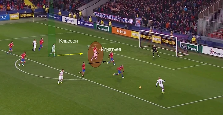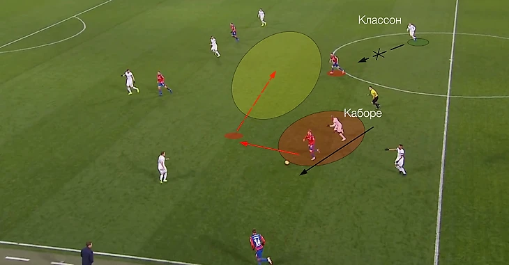 Каборе очень легко отпускает Сигурдссона. Классон не смещается по Дзагоеву, который примет мяч в пустой опорной зоне и доведет дело до удара из штрафной.