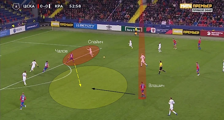Спайич упускает за спиной Чалова. Влашич насыщает пустую опорную зону. Синицын не выручает.