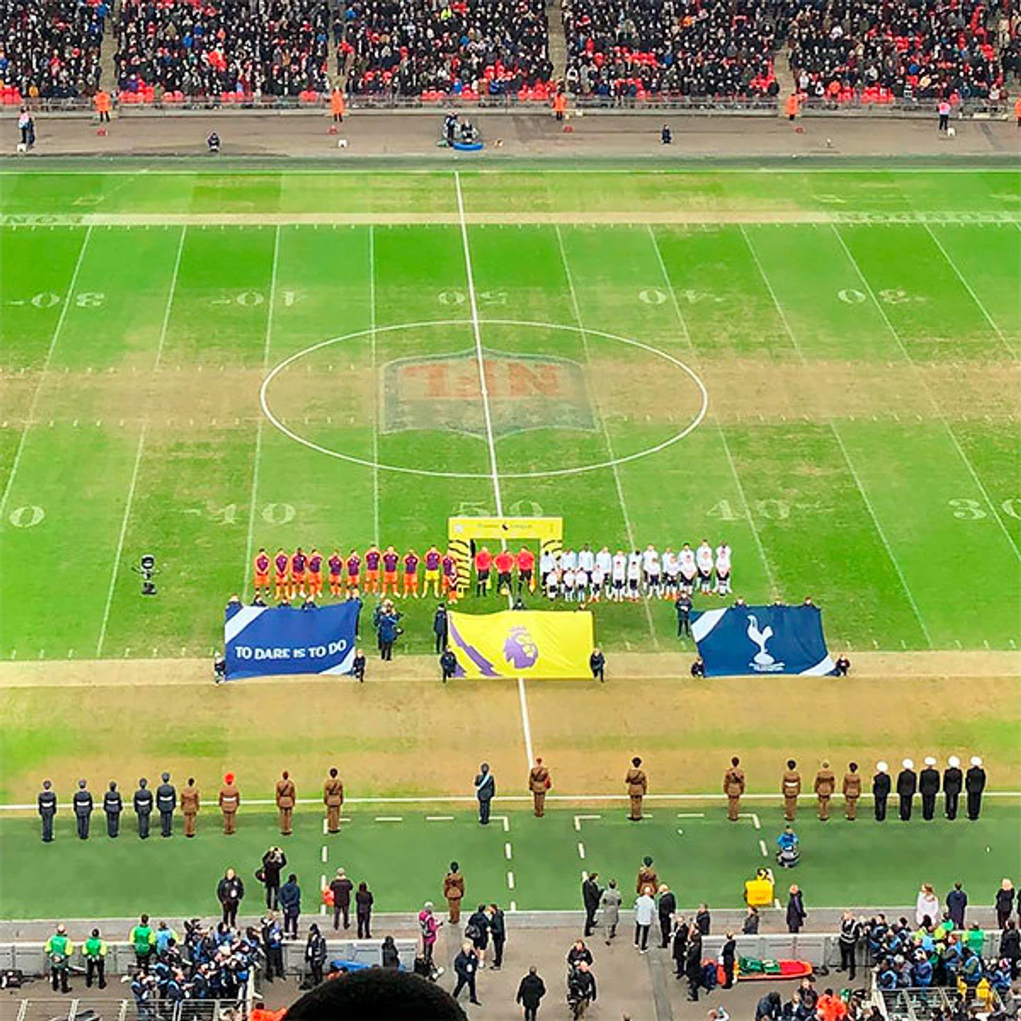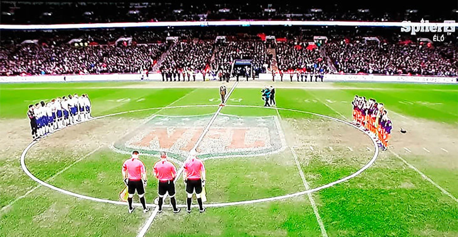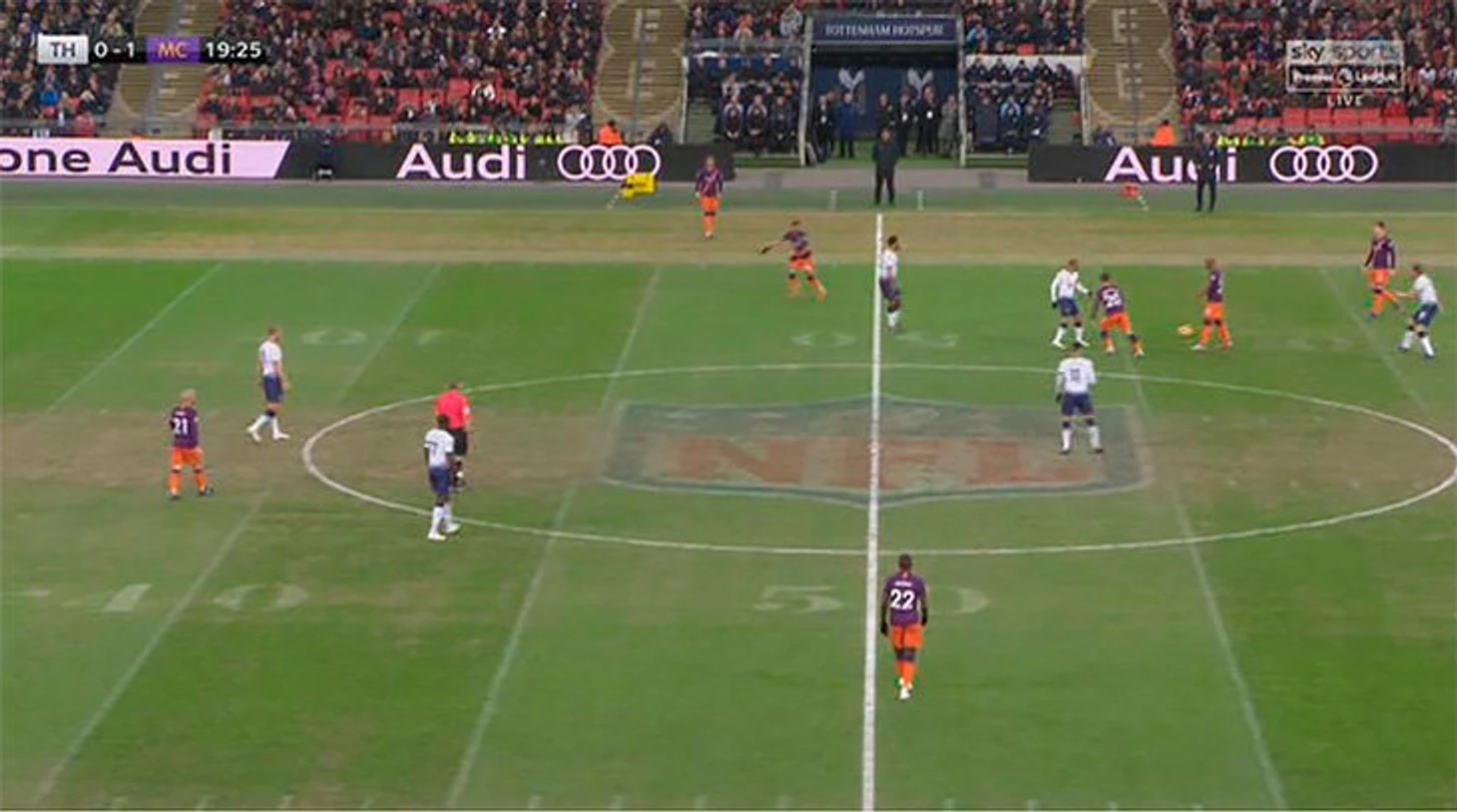 В результате команды Почеттино и Гвардиолы играют на поле с разметкой для американского футбола и огромным лого НФЛ прямо в центральном круге.