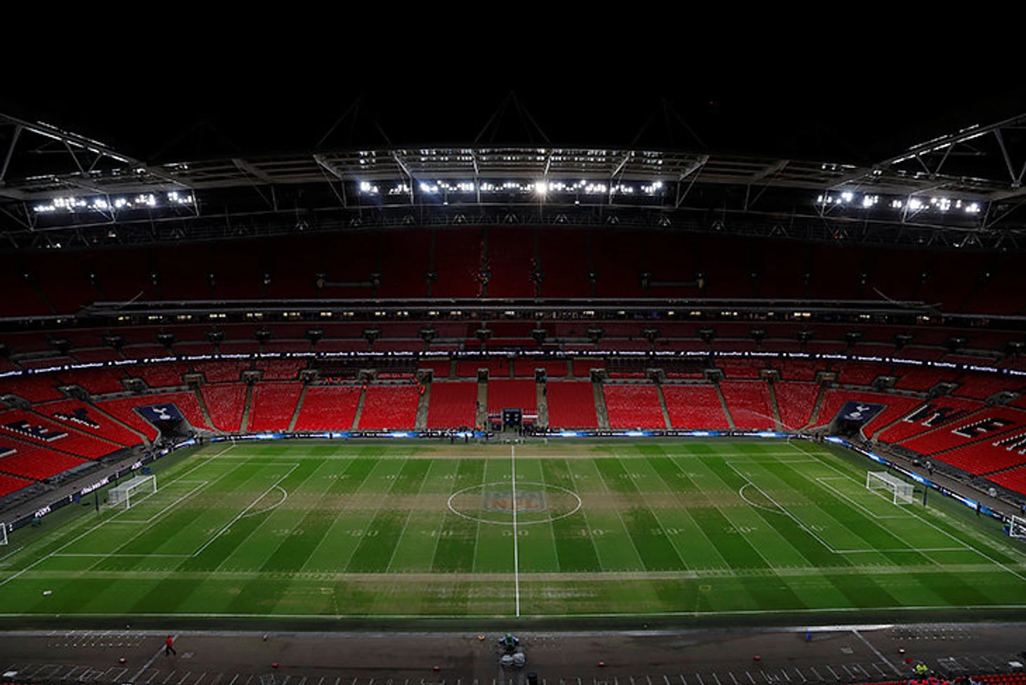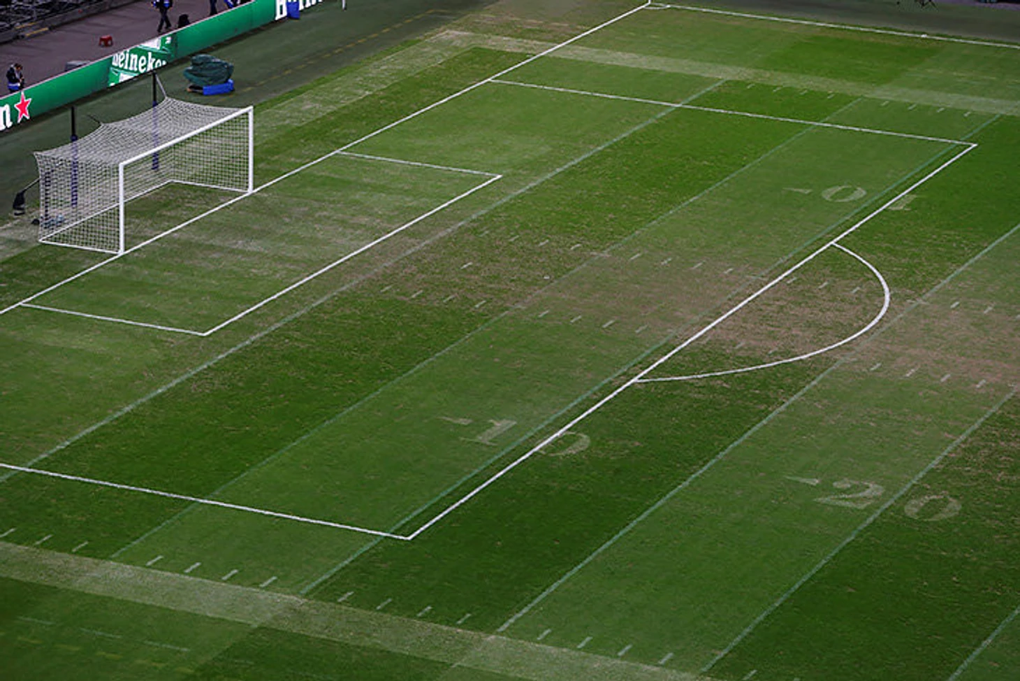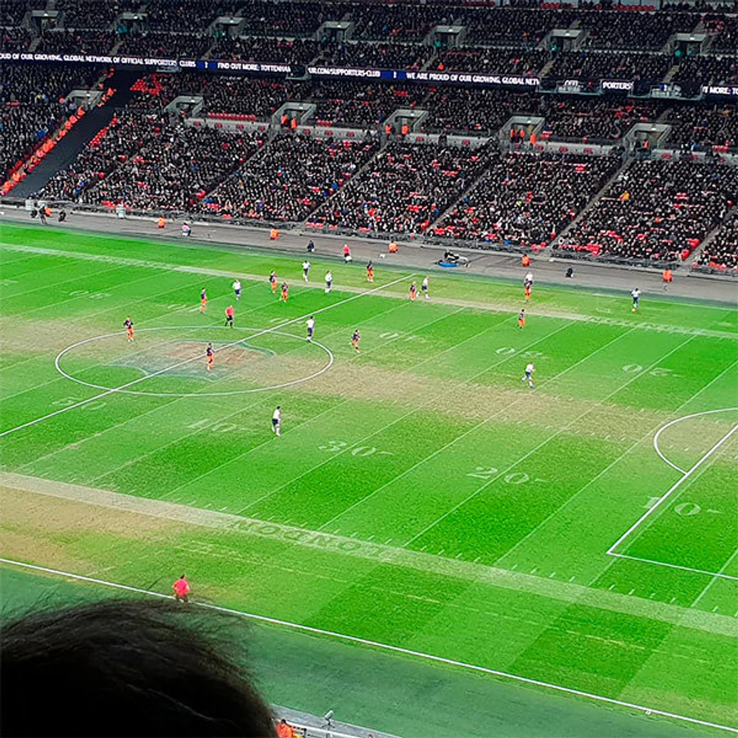 Дело в том, что еще вчера тут играли в американский футбол. Каждый сезон НФЛ проводит несколько матчей в Лондоне – вчера на «Уэмбли» встретились «Филадельфия» и «Джексонвилль». Это они испортили поле.