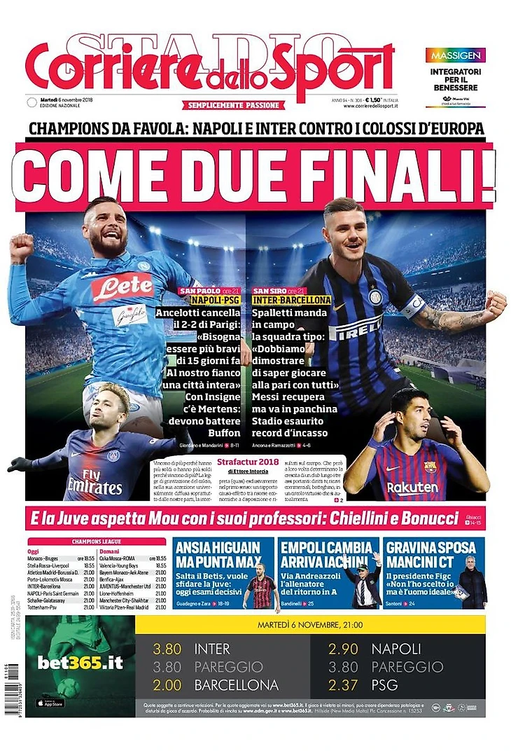 «Наполи» и «Интер» против колоссов Европы. «Сан Паоло», 21:00 (CET), «Наполи»-«ПСЖ». Анчелотти исключает парижские 2:2: «Необходимо быть более смелыми, чем 15 дней назад. На нашей стороне целый город». С Инсинье есть Мертенс: они должны победить Буффона. «Сан Сиро», 21:00 (CET), «Интер»-«Барселона». Спаллетти выпускает на поле основной состав: «Мы должны продемонстрировать умение играть на равных со всеми». Месси восстановился, но будет на скамейке. На стадионе аншлаг и рекорд выручки.
