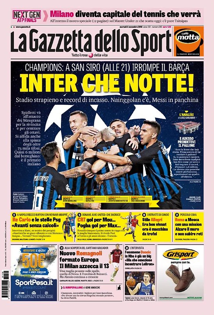 Лига Чемпионов: на «Сан Сиро» (21:00 CET) врывается «Барса». Стадион сверхполон и получена рекордная выручка. Наингголан сыграет, Месси на скамейке. Спаллетти пускается в атаку на сине-гранатовых из-за мести и чтобы выйти в 1/8-финала. Он также полагается на поддержку более 73 тысяч болельщиков. Почти 6 миллионов кассовых сборов: это лидерство в Италии.
