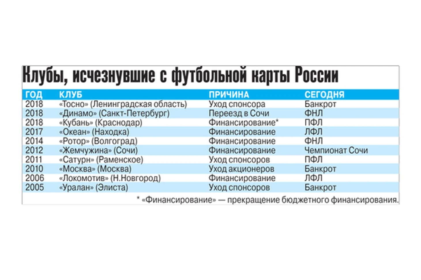 “Тосно”, 2018 год. Второй представитель премьер-лиги прошлого сезона, не доживший до осени. Команда была основана пять лет назад, но сумела быстро подняться в элитный дивизион. В июле прошлого года клуб дебютировал в высшем дивизионе, а уже весной выиграл кубок страны. Вместо участия в Лиге Европы “Тосно” получил иски от футболистов, перед которыми есть долги по зарплате. Уже в июне команда из Ленинградской области была расформирована.