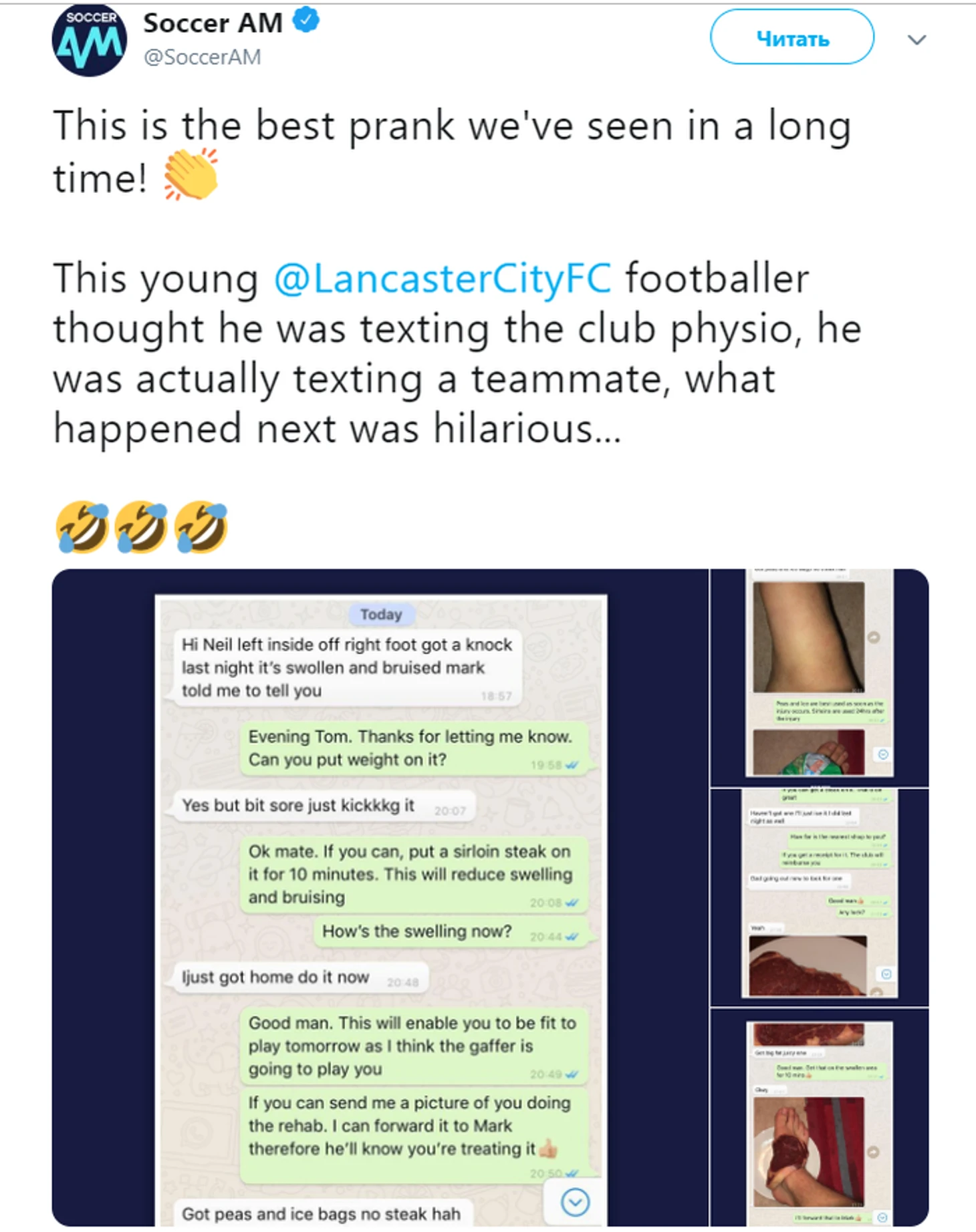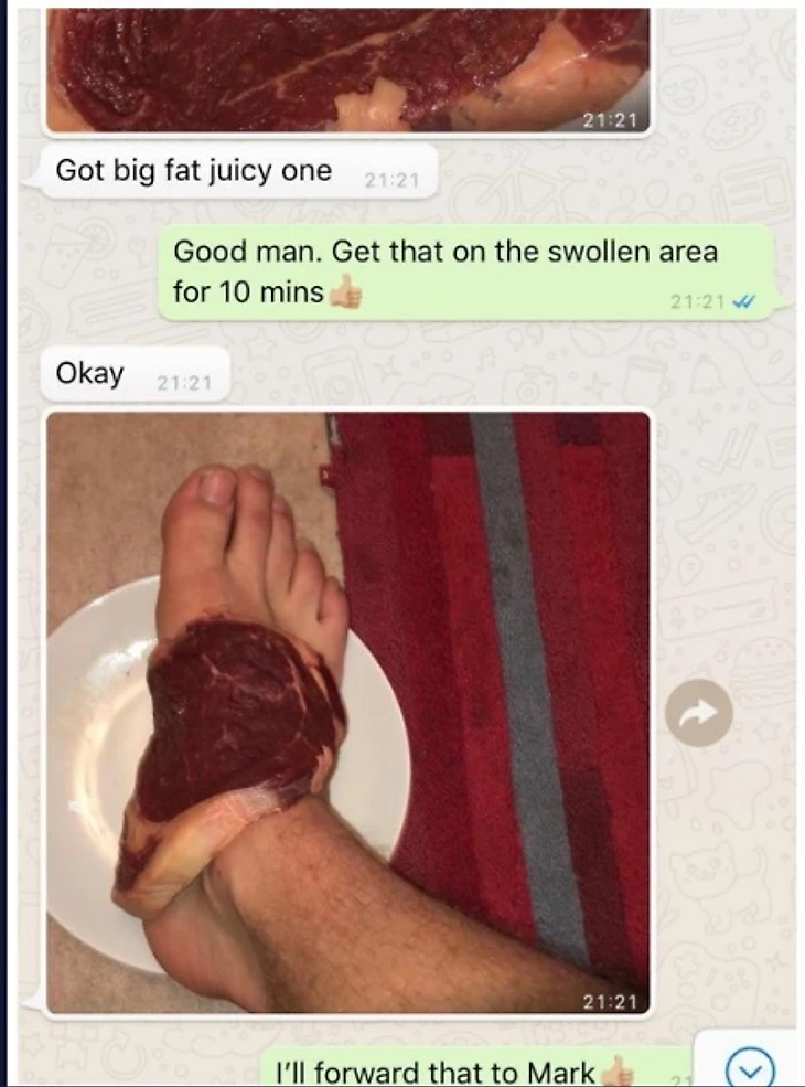 Молодой футболист сначала хотел лечиться более привычными способами, однако "физиотерапевт" настоял на своей методике, а также сказал ему прислать фотографию, когда мясо будет на ноге.
