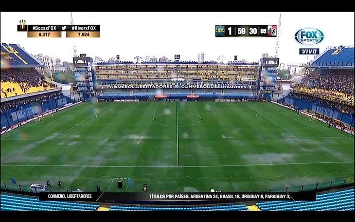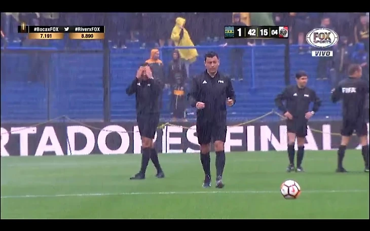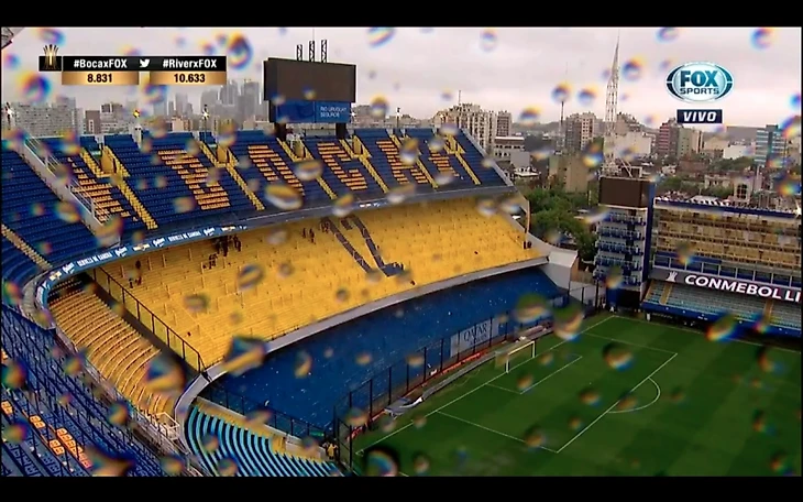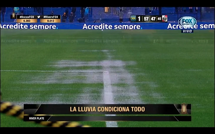 В Буэнос-Айресе, где сегодня вечером должен был пройти первый матч финала Кубка Либертадорес, после обеда идёт сильный дождь. За полдня выпало 40 мм осадков, что равно половине месячной нормы. На телекартинке видно, что поле в некоторых местах затопило: