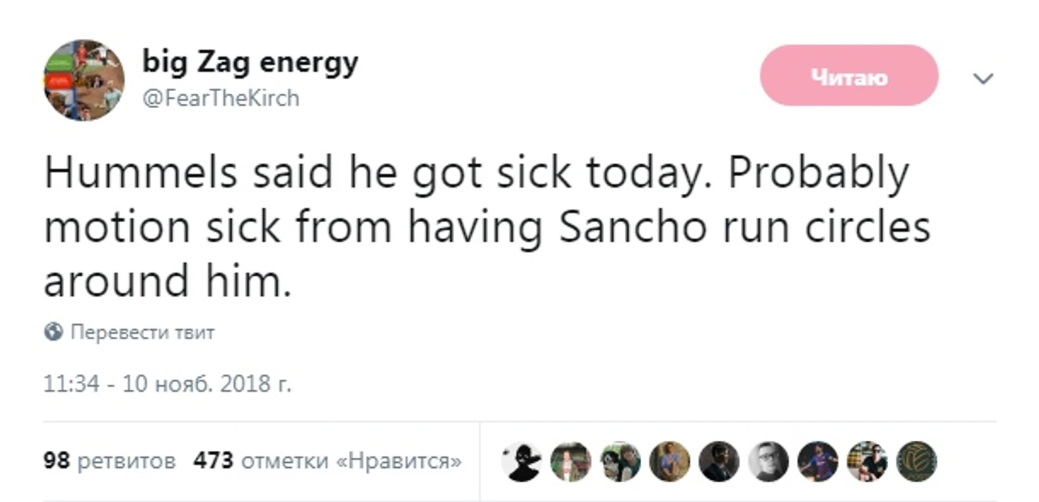 Хуммельс сказал, что ему стало плохо сегодня. Возможно, у него закружилась голова и появилась тошнота из-за того, что Санчо наматывал круги вокруг него.
