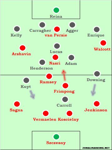 Это дало «Ливерпулю» фундамент для построения своего движения, а Мейрелеш и Суарес стали именно теми, кто создавал моменты. В обороне «Арсенала», перестроившегося в 4-4-1, стало возникать пространство между линиями, где успешно проходили передачи, а свежий Суарес предложил больше движения по сравнению с Кэрроллом. Передачи Мейрелеша на Суареса привели к обоим голам. Первый гол: немного повезло с отскоком от груди Рэмзи, второй – превосходная работа. Суарес нашёл достаточно времени и пространства для выполнения передач на ближней к чужим воротам трети поля.