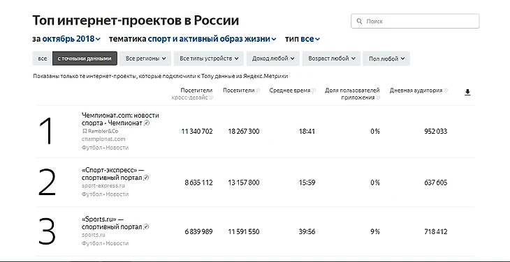 Если честно, я удивлен, что по количеству посещений «Чемпионат» и «Спорт-Экспресс» оказались выше, ведь создаваемый ими контент явно ниже уровнем, чем у ребят со «Спортса». Наверное, дело в постоянных интервью с футболистами и тренерами, которые почему-то предпочитают посещать эти издания, а не попадать на «Трибуну». Тем не менее, это все дело времени. Уверен, что в ближайшем будущем статистика на «Яндекс.Радар» потерпит некоторые изменения.