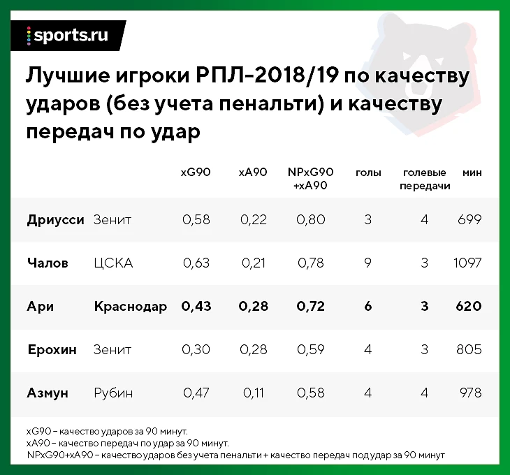 Ари – пятый игрок лиги по xG90 (качество ударов за 90 минут) и второй-третий – по xA90 (качество передач по удар). Вместе с нападающим «Краснодара» в топ-10 по обоим показателям входит только Себастьян Дриусси, но по качеству ассистов аргентинец идет девятым.