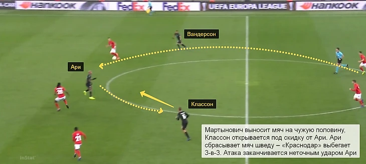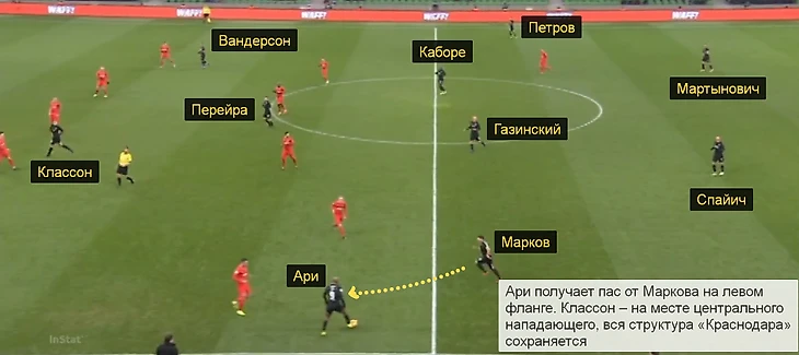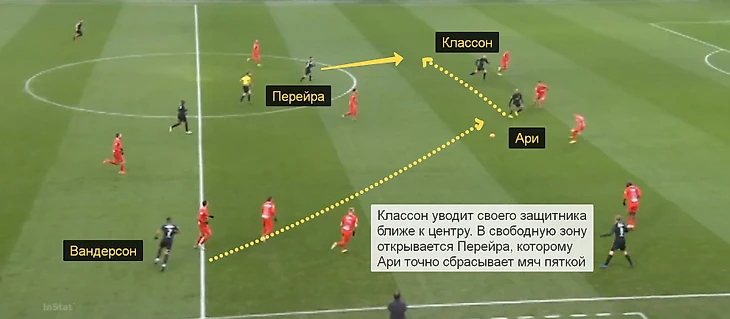 В каждом матче Ари по 3-4 раза опускается очень глубоко для розыгрыша мяча в позиционной атаке. В этот момент зону центрального нападающего заполняют Классон или Вандерсон (чаще – швед), поэтому атакующая структура Мусаева не страдает.