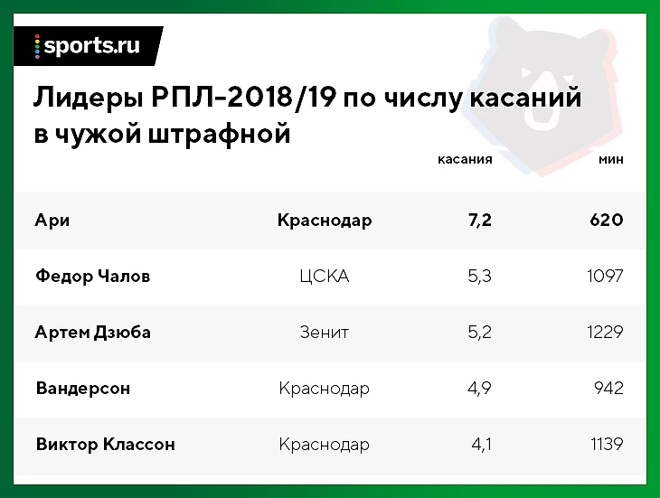 На другие атакующие цифры Ари сильно влияет стиль и качество игры «Краснодара». Например, команда Мусаева чаще всех в лиге входит в штрафную соперника с мячом (19 раз за матч, «Зенит» – 18, ЦСКА – 16). Преимущество Ари по числу касаний в чужой штрафной за 90 минут перед всеми впечатляет, но нужно делать скидку на то, что бразилец играл меньше остальных.