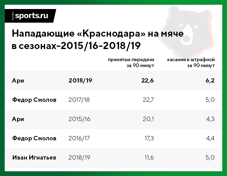 В прошлом сезоне Смолов принимал столько же передач, сколько Ари сейчас, но Федор намного реже касался мяча вблизи чужих ворот.