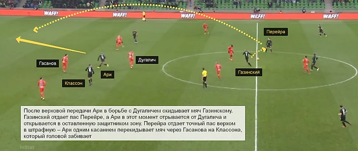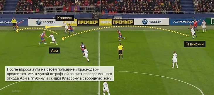 Ари вовремя отрывается от соперников и под длинные передачи из глубины. Например, несколько дней назад своевременное и умное открывание привело к голу Классона в ворота «Енисея».