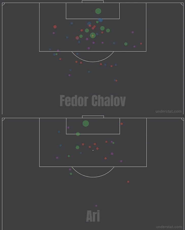 Карты ударов Федора Чалова и Ари в РПЛ-2018/19. Зеленые круги – голы, синие – удары в створ, фиолетовые – заблокированные удары, красные – удары мимо.