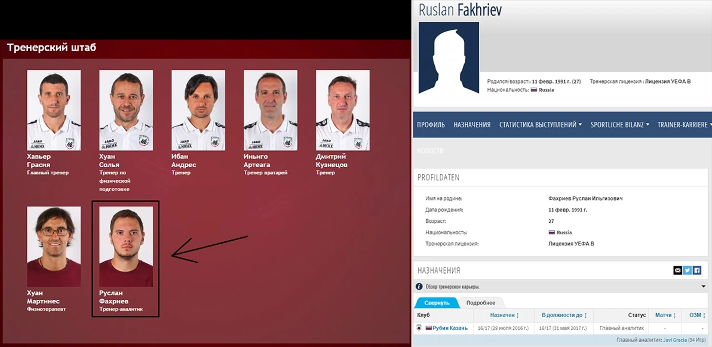 В тренерском штабе Грасии чудесным (да-да именно) образом оказался сын генерального директора клуба Ильгиза Фахриева Руслан. А числился он там не простым помощником, а главным аналитиком команды. Достаточно серьёзная должность в команде,так как в его обязанности входили: подготовка отчёта о сопернике перед игрой, разбор игры своей команды и другие важные задачи. Но самое удивительное это то, что до «Рубина» Руслан Фахриев нигде не работал в качестве тренера-аналитика и опыта в данной должности у него не было. Но это не проблема, ведь папа поможет.