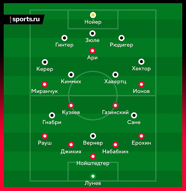 По Рюдигеру (левому центральному защитнику) чаще всего действовал Ари, по Зюле (страхующему в тройке) – Алексей Миранчук, а Гинтер (правый центральный защитник) логично оставался один. Как только партнеры пасовали Гинтеру, на него выдвигался Ерохин, до этого перекрывавший правого латераля Керера. Керер без давления получал передачи от Гинтера и центральных полузащитников – Германия спокойно переходила на нашу половину поля.