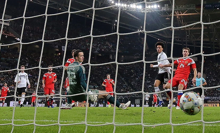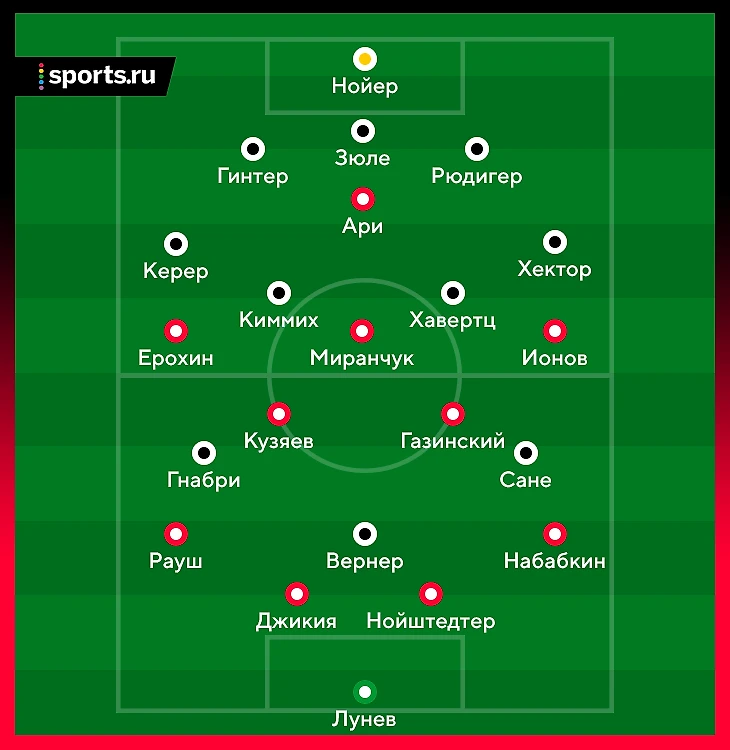 В старте России вышли Набабкин и Алексей Миранчук, а Ерохин появился слева, но структура по сравнению с последними матчами не поменялась: 4-2-3-1 при позиционных атаках, 4-4-2 без мяча. Эта формация провалилась сразу – наши оказались беспомощны перед розыгрышем мяча тремя центральными защитниками немцев.