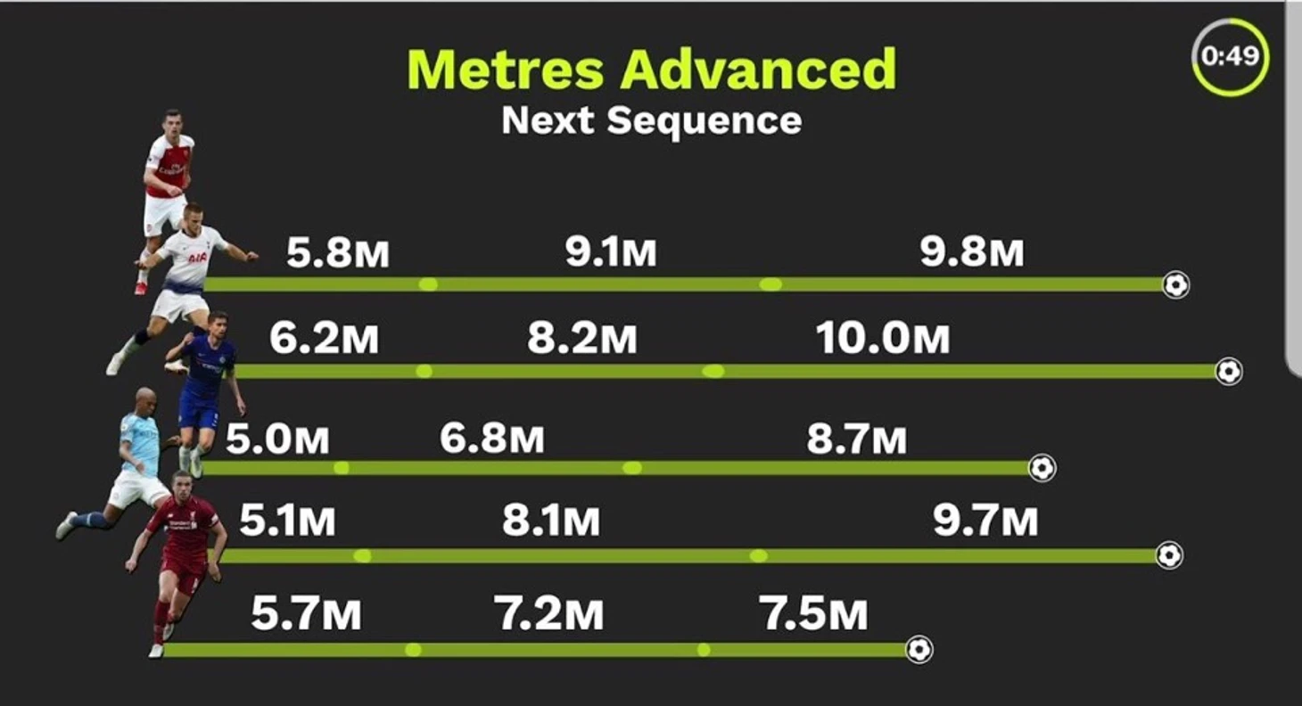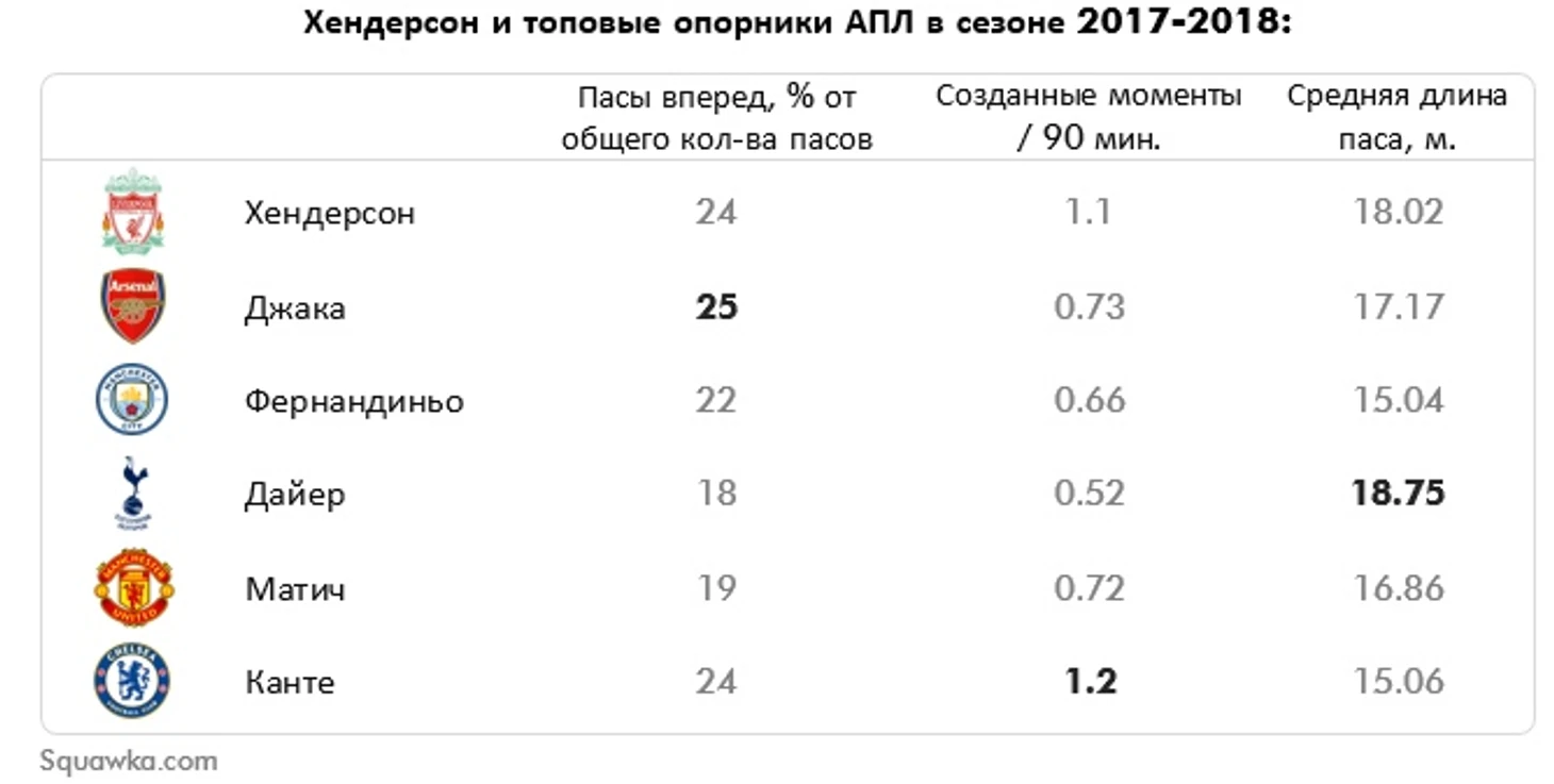 Несколько недель назад Football Whispers даже сделали исследование на эту тему – они посмотрели, что происходит с мячом после того, как каждый из опорников отдает мяч партнеру. Условно, они проследили, на сколько метров вперед продвигается атака после паса Хендерсона партнеру, от партнера – второму партнеру, и от второму – третьему. Вышло так, что несмотря на то, что Хендерсон изначально достаточно неплохо пасует вперед (на 5.7 метров в среднем), после этого атака в среднем продвигается хуже, чем у любого из опорников других топ-клубов: