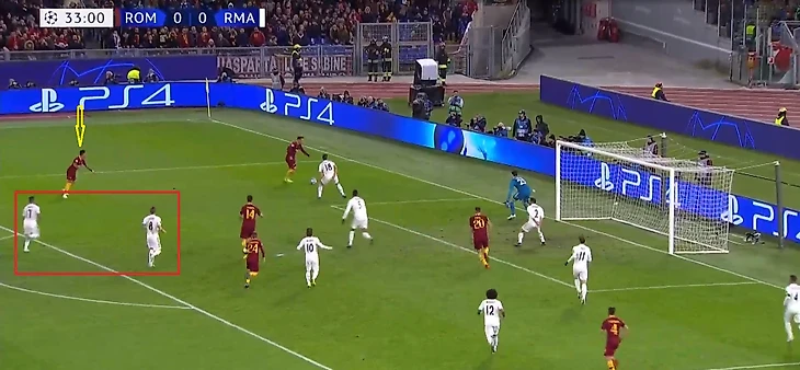 По истечению 30 минут игры, стали возникать проблемы и в обороне. Рома стала более активно накрывать Мадрид. Римляне, как и почти все противники сливочных, пытались прорваться к воротам Куртуа через левый фланг обороны королевского клуба.